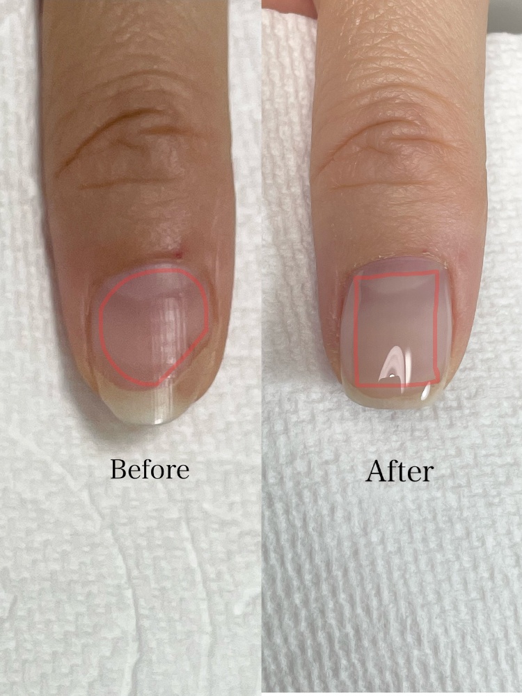少しずつではありますが、爪の形が縦長にかわっていきました。また、爪のカーブも少しずつ変化して、スラッとした爪に見えるようになりました。