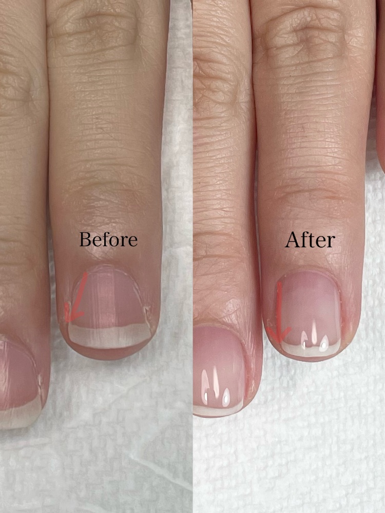 爪のピンクの部分が前より縦長になり、キレイな爪になりました。また、毎回爪のケアをしてくださるので腫れることもなくなりました。